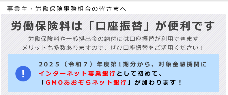 - 労働保険料・一般拠出金の納付には口座振替が利用できます。メリットも多数ありますので、ぜひご利用ください。